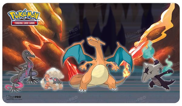 Description: Playmats for Pokémon feature vibrant, full-color artwork of Charizard, Salazzle, Torkoal, and Alolan Marowak. Made with a soft fabric top to reduce damage to cards during play and a non-slip rubber backing to keep the playmat from shifting during use, playmats enhance the gameplay experience. With dimensions of approximately 24 in. x 13.5 in., a playmat also makes an excellent oversize mousepad for home or office.