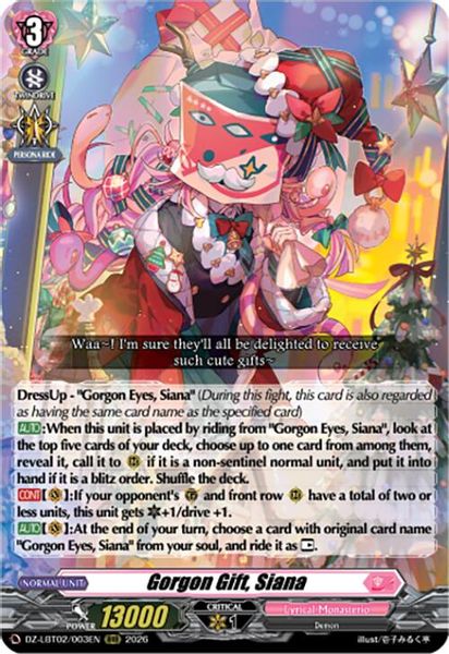 [AUTO]:When this unit is placed by riding from "Gorgon Eyes, Siana", look at the top five cards of your deck, choose up to one card from among them, reveal it, call it to (RC) if it is a non-sentinel normal unit, and put it into hand if it is a blitz order. Shuffle the deck.