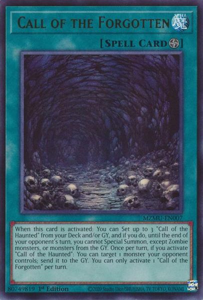 Description: When this card is activated: You can Set up to 3 "Call of the Haunted" from your Deck and/or GY, and if you do, until the end of your opponent's turn, you cannot Special Summon, except Zombie monsters, or monsters from the GY. Once per turn, if you activate "Call of the Haunted": You can target 1 monster your opponent controls; send it to the GY. You can only activate 1 "Call of the Forgotten" per turn.