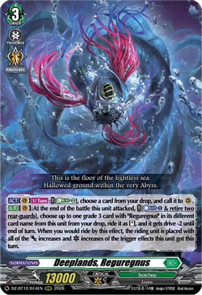 [AUTO](VC):At the end of the battle this unit attacked, [COST][Counter-Blast 1 & retire two rear-guards], choose up to one grade 3 card with "Reguregnus" in its different card name from this unit from your drop, ride it as [Stand], and it gets drive -2 until end of turn. When you would ride by this effect, the riding unit is placed with all of the [Power] increases and [Critical] increases of the trigger effects this unit got this turn.
